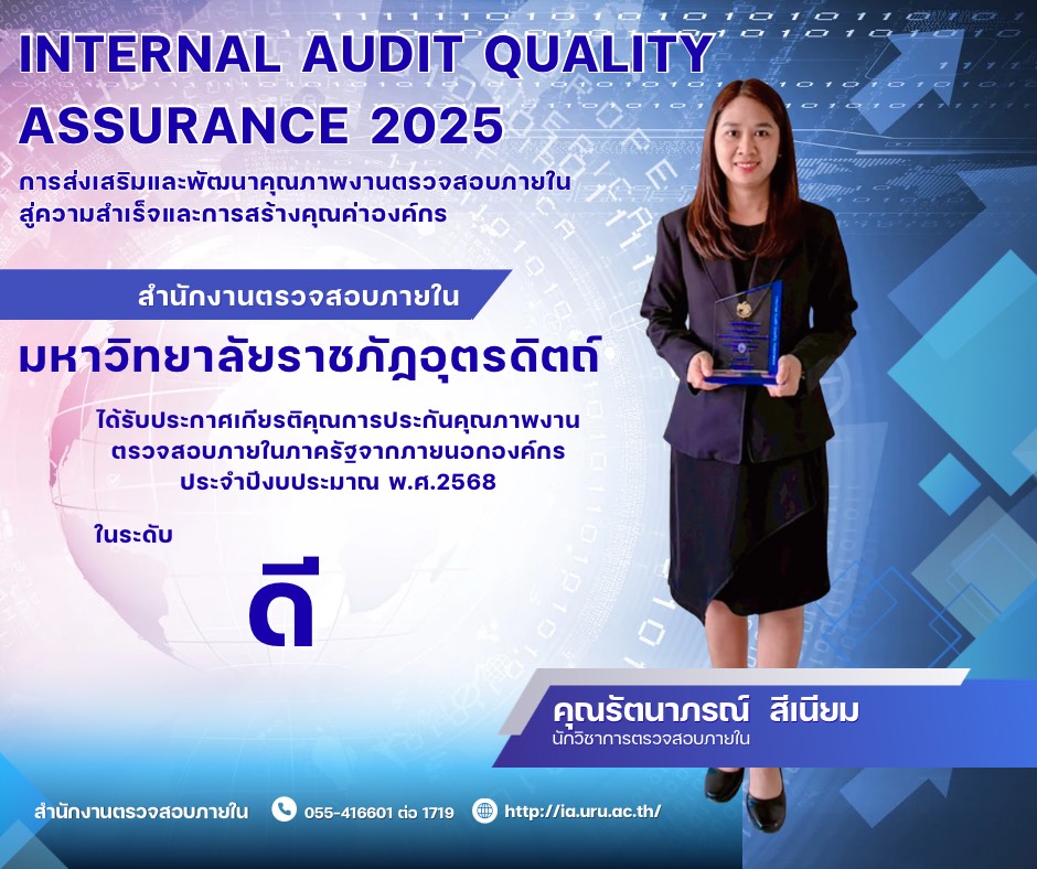กรมบัญชีกลางจัดพิธีมอบประกาศเกียรติคุณการประกันคุณภาพงานตรวจสอบภายในภาครัฐจากภายนอกองค์กร ประจำปีงบประมาณ พ.ศ. 2568 นางแพตริเซีย มงคลวนิช อธิบดีกรมบัญชีกลาง เป็นประธานในพิธีมอบประกาศเกียรติคุณการประกันคุณภาพ งานตรวจสอบภายในภาครัฐจากภายนอกองค์กร ประจำปีงบประมาณ พ.ศ. 2568 ในโครงการสัมมนาการประกันคุณภาพงานตรวจสอบภายในภาครัฐ ประจำปีงบประมาณ พ.ศ. 2569 โดยมีนางสาวสุดท้าย ชัยจันทึก ที่ปรึกษาด้านพัฒนาระบบบัญชีและคณะกรรมการประเมินผลการประกันคุณภาพงานตรวจสอบภายในภาครัฐ ร่วมเป็นเกียรติในพิธี ณ ห้องประชุมแวนด้า แกรนด์ บอลรูม โรงแรมเบสท์ เวสเทิร์น พลัส แวนด้า แกรนด์ จ.นนทบุรี วันที่ 29 มกราคม 2569 กรมบัญชีกลางในฐานะหน่วยงานกลางที่มีหน้าที่กำกับดูแลการตรวจสอบภายในภาครัฐ ตระหนักถึงความสำคัญในการพัฒนาและยกระดับการปฏิบัติงานตรวจสอบภายในภาครัฐให้มีคุณภาพและสอดคล้องกับมาตรฐานสากล รวมถึงบริบทของประเทศไทย เพื่อสร้างมาตรฐานด้านการปฏิบัติงานตรวจสอบภายในของหน่วยงานของรัฐอย่างเป็นระบบเสริมสร้างความเชื่อมั่นให้แก่ผู้บริหารและผู้ปฏิบัติงานในหน่วยงานภาครัฐ ทั้งด้านประสิทธิภาพ ประสิทธิผลการดำเนินงานว่าจะสามารถปฏิบัติงานได้บรรลุวัตถุประสงค์และเป้าหมายตามนโยบายของหน่วยงาน นำไปสู่การกำกับดูแลองค์กรที่ดี มีธรรมาภิบาลในการบริหารและการปฏิบัติงาน อันจะส่งผลให้เกิดความน่าเชื่อถือกับการบริหารงานของภาครัฐในภาพรวมทั้งหมด และเพื่อสนับสนุนส่งเสริม รวมทั้งสร้างขวัญและกำลังใจให้แก่ผู้ตรวจสอบภายในของหน่วยงานของรัฐที่มีผลการประเมินในระดับดีและระดับดีเยี่ยม ในการนี้มีหน่วยงานที่ได้รับประกาศเกียรติคุณฯ ในระดับดีเยี่ยม จำนวน 16 หน่วยงาน และในระดับดี จำนวน 30 หน่วยงาน รวมทั้งสิ้น 46 หน่วยงาน สำนักงานตรวจสอบภายใน มหาวิทยาลัยราชภัฏอุตรดิตถ์ ได้รับประกาศเกียรติคุณ การประกันคุณภาพงานตรวจสอบภายในภาครัฐจากภายนอกองค์กร ประจำปีงบประมาณ พ.ศ. 2568 ในระดับ " ดี "